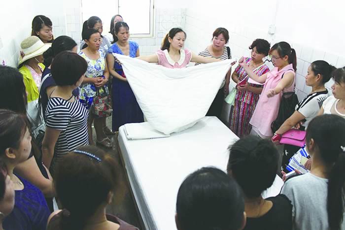 圖為轉(zhuǎn)崗分流人員培訓(xùn)現(xiàn)場,授課教師鐘燕林正在傳授保潔技能。