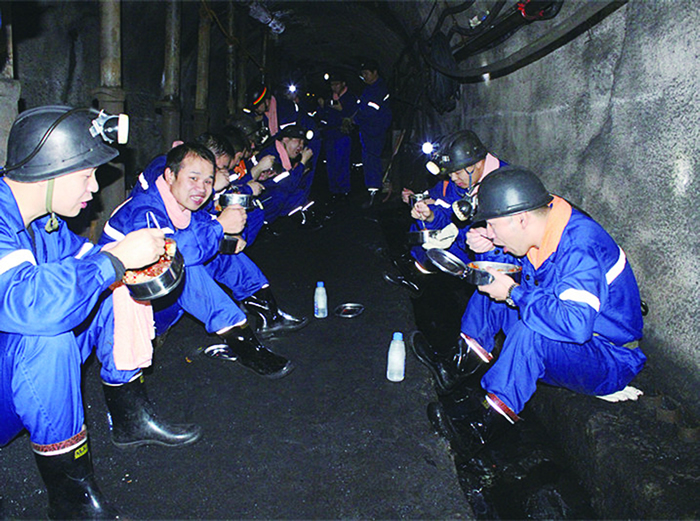 圖為萍鄉(xiāng)市委組織部機(jī)關(guān)干部與安源煤礦采三區(qū)礦工在井下共進(jìn)班中餐。鐘江波 攝