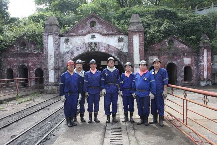 圖為曾昭和(中)在集團公司總經(jīng)理劉伏生,黨委書記吳培南,副總經(jīng)理、總工程師彭群倫陪同下,深入安源煤礦井下。