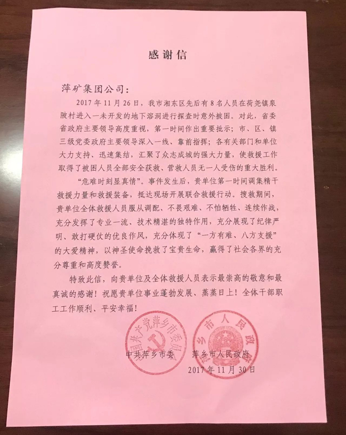 12月1日上午,萍礦集團公司接到了一封萍鄉(xiāng)市委市政府送來的感謝信,對公司積極派人參與成功救援湘東荷堯地下溶洞人員被困行動表示感謝。 26日上午10時30分許,有8人先后進入湘東區(qū)荷堯鎮(zhèn)一未開發(fā)溶洞進行探查時被困,牽動了各級政府和百姓的心。經(jīng)過各方大力救援,27日成功救出3人,另有5名被困人員未找到。生命至上,人命關天。27日傍晚18時30分,萍礦集團接到上級要求派員參與救援行動的通知后,公司黨政領導高度重視,第一時間作出部署,抽調人員組織精干團隊,由副總經(jīng)理、總工程師彭群倫帶隊,生產(chǎn)技術部副部長鄒云福、安源煤礦機電副總工程師鄒林和制修廠副廠長張其組成應急救援小組,帶上相應設備,立即趕赴人員被困現(xiàn)場。隨后,又派出了湘雅萍礦合作醫(yī)院應急救援隊成員孫亞斌、肖饒軍、江麗和倪堅組成的救援小組立即趕赴現(xiàn)場。 救援現(xiàn)場,應急救援小組成員憑借多年的工作經(jīng)驗和專業(yè)優(yōu)勢,積極參與救援。為更好地掌握情況,為指揮部制定科學的救援方案提供依據(jù),彭群倫和鄒云福等人進入溶洞勘察地形。洞內隧道寬窄不一,寬敞處多有暗河流經(jīng)或需涉水而過,積水齊人腰深,不一會兒,幾個人全身都濕透了。狹窄處只容一人匍匐前行,堅硬的巖石刺得手臂生痛,但大伙都沒有退卻。仔細觀察了地形地貌,了解情況后,彭群倫及時向指揮部進行匯報,并提出了救援建議。湘雅萍礦合作醫(yī)院應急救援小組也一直堅守在現(xiàn)場,就地講授救援知識,對因連續(xù)作戰(zhàn)出現(xiàn)虛脫的消防救援人員進行醫(yī)療救援。 11月29日凌晨4時許,經(jīng)過科學救援,溶洞中最后5名被困人員被成功救出,且均身體狀況良好。直到這時,堅守現(xiàn)場的救援人員才長長地舒了一口氣。整個救援過程中,萍礦集團公司領導密切關注現(xiàn)場救援情況,與應急救援小組成員保持緊密聯(lián)系,從人力物力上給予支持。參與現(xiàn)場救援的人員紀律嚴明、服從調配、艱苦奮戰(zhàn),充分體現(xiàn)了國有企業(yè)的擔當精神,和“一方有難、八方支援”的大愛精神,共同演繹了一場溫馨的小城大愛。(謝紅英 攝)
