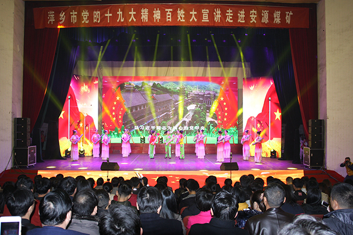 12月12日下午,安源煤礦工人俱樂(lè)部大禮堂內(nèi)歌聲悠揚(yáng)。由萍鄉(xiāng)市委宣傳部主辦,市委講師團(tuán)承辦的“貫徹十九大、萍鄉(xiāng)看變化、立足本職作貢獻(xiàn)”黨的十九大精神百姓大宣講安源煤礦專(zhuān)場(chǎng)在此舉行。整個(gè)大禮堂內(nèi)座無(wú)虛席,高潮迭起,處處涌動(dòng)著百年老礦“義無(wú)反顧、敢為人先”踏上改革創(chuàng)新新征程的激情與豪邁。 江西省委講師團(tuán)副團(tuán)長(zhǎng)彭波,省委宣傳部理論處副處長(zhǎng)張君華,萍鄉(xiāng)市委宣傳部常務(wù)副部長(zhǎng)張運(yùn)連,市文廣新局局長(zhǎng)劉曉峰,萍礦集團(tuán)黨委副書(shū)記、工會(huì)主席漆云飛等領(lǐng)導(dǎo)和安源煤礦近700名職工一同觀看了演出。 一首聲情并茂的漁鼓說(shuō)唱《百姓宣講我先行》拉開(kāi)了專(zhuān)場(chǎng)演出的序幕,一下子就吸引了所有人的視線。頗具萍鄉(xiāng)特色、朗朗上口的語(yǔ)句,不僅唱出了美麗的中國(guó)夢(mèng),也說(shuō)出了大家對(duì)百年煤城大變樣的由衷贊美。由萍鄉(xiāng)市合唱團(tuán)、退休工人以及小學(xué)生共同表演的器樂(lè)合奏《賽馬》,熱烈奔放的節(jié)奏、高昂的旋律引發(fā)了全場(chǎng)觀眾的強(qiáng)烈共鳴,讓大家在重溫萍鄉(xiāng)籍作曲家黃海懷先生譜寫(xiě)的經(jīng)典作品的同時(shí),深切感受到新時(shí)代的脈動(dòng),進(jìn)一步激發(fā)了立足崗位、干事創(chuàng)業(yè)的激情。 從雙人宣講《立足本職做貢獻(xiàn)》到情景詩(shī)朗誦《誦讀經(jīng)典話百年》,從《為人民謀幸福,為民族謀復(fù)興》的主題宣講到《貫徹十九大,萍鄉(xiāng)說(shuō)變化》,到大型歌舞《天耀中華》,生動(dòng)展現(xiàn)了中國(guó)的改革發(fā)展歷程和祖國(guó)的繁榮昌盛,以及萍鄉(xiāng)創(chuàng)建文明城市帶來(lái)的環(huán)境、街道、人文等諸多方面的巨大變化,增強(qiáng)了職工群眾的歸屬感和幸福指數(shù)。 整場(chǎng)演出始終貫穿了“不忘初心,牢記使命”的十九大精神實(shí)質(zhì),宣講員慷慨激昂、飽滿深情的宣講和一個(gè)個(gè)動(dòng)人心弦的文藝節(jié)目把演出推向高潮,讓人耳目一新,催人奮進(jìn)。演出持續(xù)1個(gè)多小時(shí),最后全體觀眾起立,和演職人員齊聲合唱《沒(méi)有共產(chǎn)黨就沒(méi)有新中國(guó)》,氣勢(shì)雄渾的歌聲唱出了大家對(duì)新時(shí)代的向往和期待,更增強(qiáng)了大家建設(shè)美麗中國(guó)和百年煤城的決心和信心。 演出結(jié)束后,廣大職工群眾久久不愿離去,無(wú)不稱贊這是一場(chǎng)接地氣的精彩演出。有著20年黨齡的一線勞模易達(dá)清動(dòng)情地說(shuō):“黨的十九大報(bào)告不但實(shí)事求是總結(jié)了我們黨過(guò)去五年歷史性的成就,也描繪了老百姓心中對(duì)美好生活的愿景。今天十九大精神百姓大宣講專(zhuān)場(chǎng)文藝演出,將十九大精神用理論宣講和文藝演出相結(jié)合的形式表現(xiàn)出來(lái),使我們更容易理解掌握十九大精神。同時(shí),也激勵(lì)我們要進(jìn)一步學(xué)習(xí)好貫徹好十九大精神,將十九大精神融入到當(dāng)前企業(yè)深化改革、扭虧脫困工作中,為百年煤城變得更美更靚而努力奮斗!保▌⒘州x、梁新民 攝)