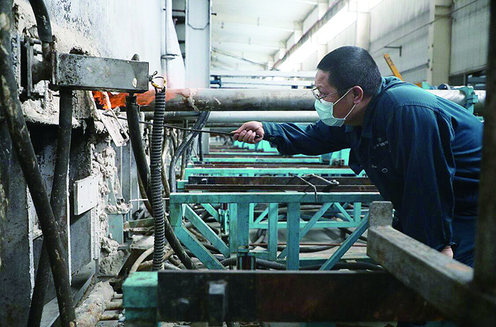堅毅——熱浪撲面而來,高溫炙烤全身。在浮法玻璃廠,職工們用堅韌不拔的毅力抵抗高溫的侵蝕,汗水打濕了他們一件又一件衣服,臉被烤得通紅,他們卻從不退縮。一塊塊玻璃在他們的努力下,被制作出來送往千家萬戶,為人們遮風(fēng)擋雨。他們是堅毅的浮玻人,他們?yōu)閵^斗而生。圖為錫槽工觀察窯內(nèi)火焰狀況。