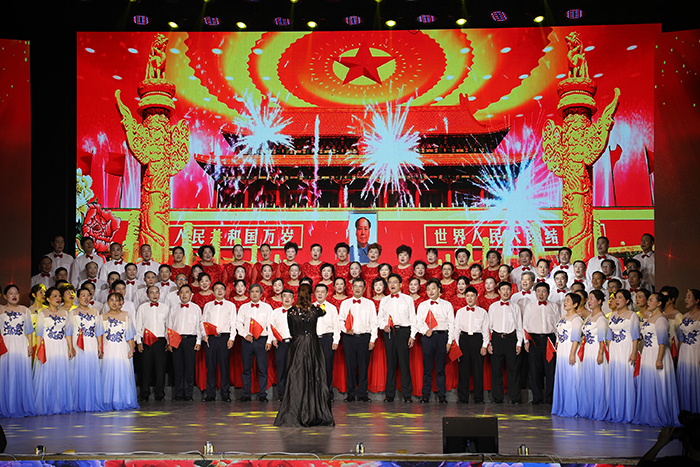 演出最后,萍礦集團(tuán)全體領(lǐng)導(dǎo)班子成員參與的百人大合唱《沒有共產(chǎn)黨就沒有新中國》把氣氛再次推向高潮,表達(dá)了萍礦兒女對黨和國家的深情與祝愿。嘹亮的歌聲,在現(xiàn)場久久回蕩。大家手揮紅旗,定格永恒。