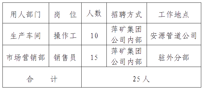 因工作需要,安源管道實(shí)業(yè)股份有限公司(下稱“安源管道公司)現(xiàn)面向萍礦集團(tuán)公司內(nèi)部公開(kāi)招聘工作人員25名,有關(guān)事項(xiàng)公告如下: