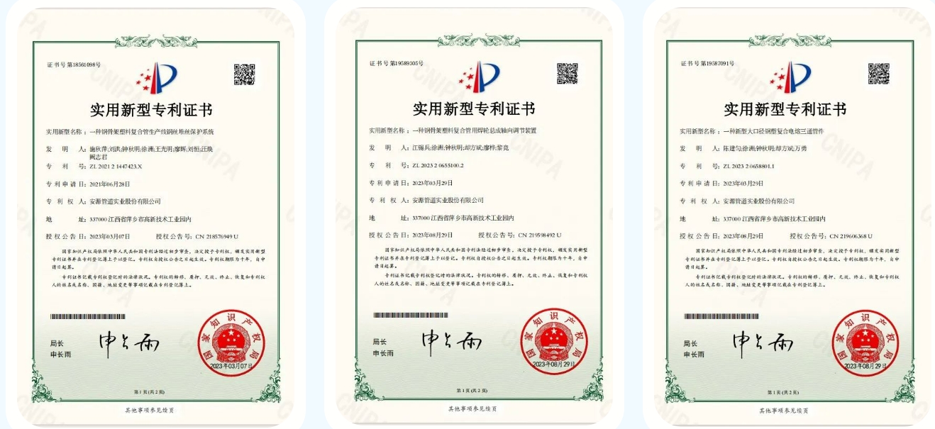 近日,安源管道公司申報(bào)的《一種鋼骨架塑料復(fù)合管生產(chǎn)線鋼絲堆絲保護(hù)系統(tǒng)》《一種新型大口徑鋼塑復(fù)合電熔三通管件》《一種鋼骨架塑料復(fù)合管用焊輪總成軸向調(diào)節(jié)裝置》3項(xiàng)實(shí)用新型專利獲得國家知識產(chǎn)權(quán)局授權(quán)。