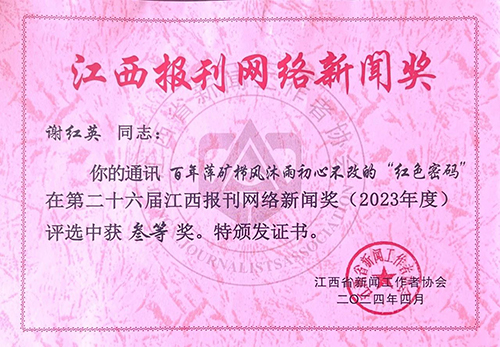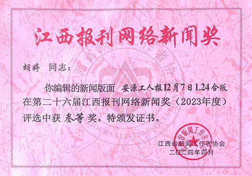 日前,第二十六屆江西報(bào)刊網(wǎng)絡(luò)新聞獎(jiǎng)評(píng)選結(jié)果揭曉,江西安源工人報(bào)社謝紅英撰寫(xiě)的《百年萍礦櫛風(fēng)沐雨初心不改的“紅色密碼”》和胡婷編輯的《安源工人報(bào)》12月7日1、24合版2件作品獲三等獎(jiǎng)。
