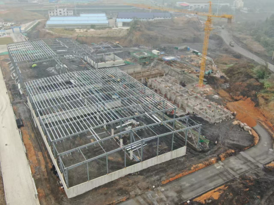 綜合原料庫:基礎(chǔ)工程完成95%,鋼結(jié)構(gòu)吊裝完成 80%。