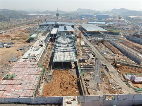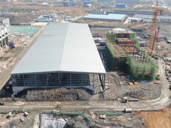 綜合原料庫(kù):基礎(chǔ)工程已完成,鋼結(jié)構(gòu)吊裝完成93%,地坪工程完成 90%。