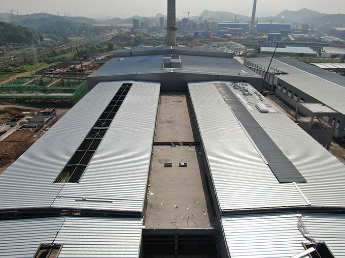 綜合原料庫:基礎(chǔ)工程已完成,鋼結(jié)構(gòu)吊裝完成95%,墻面板安裝完成 72%。
