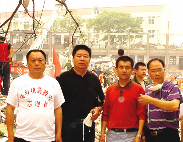 5月17日萍鄉(xiāng)志愿者在到達北川中學,右為本報記者。