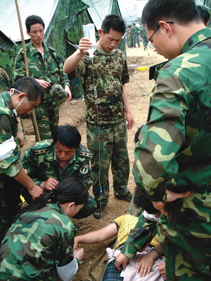 下午三點左右,記者聽說縣城發(fā)現(xiàn)了被埋的活者,準備去采訪。這時大批人員涌上來,其中七八名救援人員用擔(dān)架抬一女子飛速跑,跑到二炮野戰(zhàn)醫(yī)院帳篷進行搶救,記者現(xiàn)場采訪了那女人的弟弟,原來這女人叫李應(yīng)霞,30多歲,她丈夫是縣運輸公司的,地震中死亡。但她天天守在丈夫被埋的現(xiàn)場。剛才接到上面水壩透水,有垮堤可能,要緊急撤離的消息。于是人們飛跑,她也跑,因為身體太虛,造成休克。