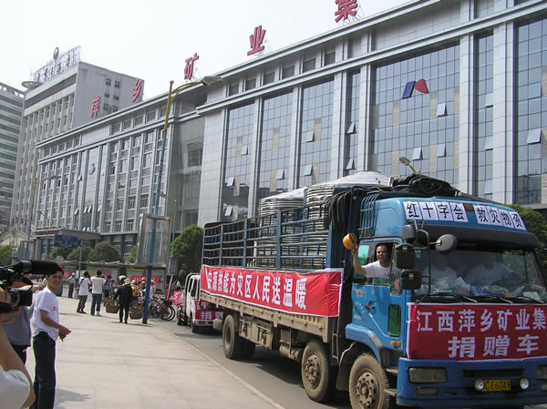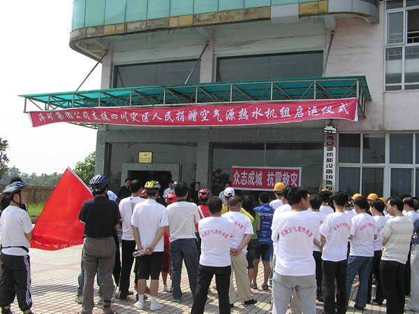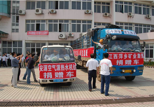 5月20日下午2點(diǎn),由集團(tuán)公司捐獻(xiàn)價(jià)值30萬元的兩臺(tái)RS-89型空氣熱能熱水機(jī)組,帶著萍礦17萬職工家屬的深情厚意送往四川地震災(zāi)區(qū)。集團(tuán)公司董事長、黨委書記彭志祥,黨委副書記黃建明,中興公司安源熱能公司員工為前往災(zāi)區(qū)的機(jī)組安裝人員送行。