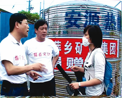 中興公司副總經(jīng)理吳祖林與安源熱能公司總經(jīng)理管光周 接受江西電視臺(tái)五套記者采訪。(黃領(lǐng) 攝) | 5月18日,安源熱能公司的同志通過(guò)四川綿陽(yáng)的經(jīng)銷商得知,大量災(zāi)民自地震以來(lái)一直洗不上熱水澡,心情非常沉重。安源熱能公司的同志很想用自己生產(chǎn)的熱能熱水機(jī)組幫助災(zāi)區(qū)人民,這一想法得到了集團(tuán)公司的支持,決定向綿陽(yáng)市捐獻(xiàn)兩臺(tái)價(jià)值30萬(wàn)元的RS-89型20噸大功率熱能熱水機(jī)組。這一決定得到了綿陽(yáng)市紅十字會(huì)的歡迎。這是萍礦人直接服務(wù)災(zāi)區(qū)人民的一件大事,接到熱能機(jī)組的生產(chǎn)任務(wù)后,安源熱能員工傾注了很大的熱情,大家加班加點(diǎn),僅用20多個(gè)小時(shí)就將兩臺(tái)RS-89型熱能機(jī)組完成生產(chǎn)組裝和調(diào)試。5月20日披掛著“萍礦集團(tuán)公司向?yàn)?zāi)區(qū)人民獻(xiàn)愛心”的大型卡車,滿載著17萬(wàn)萍礦職工家屬的深情厚意啟程出發(fā)。集團(tuán)公司董事長(zhǎng)、黨委書記彭志祥,黨委副書記黃建明親自為熱能機(jī)組車隊(duì)送行。5月21日晚上10點(diǎn)歷經(jīng)32小時(shí),安源熱能機(jī)組送達(dá)綿陽(yáng)市九州體育館。熱能機(jī)組安裝人員不顧長(zhǎng)途勞累,下了車就立即安裝施工,經(jīng)過(guò)一個(gè)通宵的奮戰(zhàn),到第二天上午10點(diǎn),讓地震后10天沒(méi)有洗過(guò)澡的災(zāi)民洗上了熱水澡。綿陽(yáng)市工會(huì)副主席夸贊安源熱能的同志:“工人階級(jí)真了不起,一個(gè)晚上這里就發(fā)生了變化!本d陽(yáng)市直工委書記李川萍說(shuō):“災(zāi)民通過(guò)洗澡,才真正有了重生的感覺(jué)!彼麑(duì)災(zāi)民說(shuō):你們洗澡的設(shè)備是萍礦集團(tuán)公司捐贈(zèng)的,他們來(lái)自江西安源。5月22日,中央電視臺(tái)記者柴靜向“抗震救災(zāi)、眾志成城”特別節(jié)目發(fā)回報(bào)道:我剛從綿陽(yáng)九州體育館出來(lái),今天有一個(gè)很好的消息,從江西的安源送來(lái)的一臺(tái)大功率熱能機(jī)組,讓500多人洗上了熱水澡,這是災(zāi)民自地震以來(lái)第一次洗澡!边@則短新聞,讓災(zāi)區(qū)人民記住了江西安源,記住了萍礦集團(tuán)。