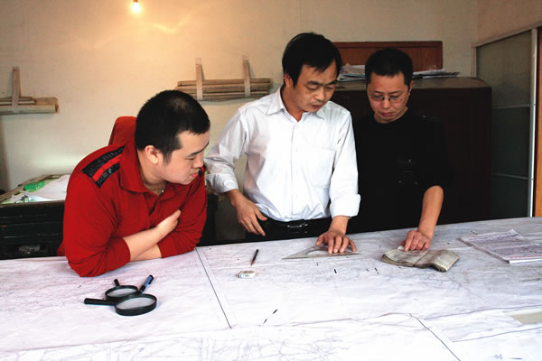 吳紹德(中)和技術(shù)人員在研究工作。(楊子申 攝)