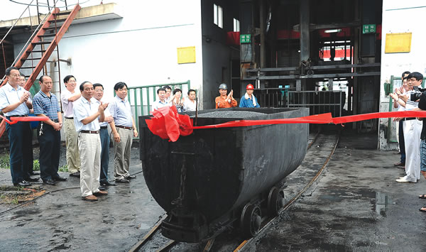 上午11時(shí)16分,宜萍煤業(yè)試運(yùn)轉(zhuǎn)后的第一桶煤從井口罐籠緩緩而出,平穩(wěn)地向前駛?cè),在通過(guò)軌道上方系著的紅綢帶時(shí),工業(yè)廣場(chǎng)內(nèi)響起了熱烈的掌聲和喜慶的鞭炮聲,這標(biāo)志著宜萍煤業(yè)礦井聯(lián)合試運(yùn)轉(zhuǎn)和首采區(qū)啟動(dòng)的成功。儀式后,彭志祥等領(lǐng)導(dǎo)還察看了原煤提升運(yùn)輸?shù)娜^(guò)程,提出了意見(jiàn)和建議,要求宜萍煤業(yè)抓住煤質(zhì)好的優(yōu)勢(shì),搞好安全生產(chǎn),加強(qiáng)瓦斯治理,做好科學(xué)管理,在試產(chǎn)、投產(chǎn)、發(fā)展的起步關(guān)鍵之年做出實(shí)實(shí)在在的成績(jī)。