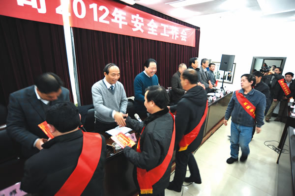 總經(jīng)理魏建明在會上講話。魏建明指出,2011年我們的安全工作抓住了關(guān)鍵性的工作,采取有力措施,防大事故,成效顯著;質(zhì)量標(biāo)準(zhǔn)化水平明顯提高,防災(zāi)抗災(zāi)能力增強(qiáng);瓦斯治理做了艱苦細(xì)致的工作,嚴(yán)防死守。就做好今年的安全工作,魏建明著重強(qiáng)調(diào)了五點(diǎn):第一、2012年必須實(shí)現(xiàn)安全年,公司上下都要把思想統(tǒng)一到這個(gè)目標(biāo)上來。第二、各單位要拿出切實(shí)可行的措施,確保安全目標(biāo)的實(shí)現(xiàn)。高坑、安源、青山、白源4礦和宜萍煤業(yè)公司質(zhì)量標(biāo)準(zhǔn)化要達(dá)一級,楊橋、巨源、黃沖3個(gè)礦達(dá)二級。第三、加強(qiáng)班組建設(shè)和班組安全管理,各單位在抓班組建設(shè)中要向楊橋、高坑兩礦學(xué)習(xí),把班組建設(shè)工作提升一個(gè)高度。第四、推進(jìn)采掘機(jī)械化,通過推廣使用采掘機(jī)械化,改變萍礦機(jī)械化水平低的現(xiàn)狀,提高安全生產(chǎn)基礎(chǔ)。第五、重視做好宜萍煤業(yè)施工開采的瓦斯監(jiān)管,以及防大汛、防大事故和主要提升設(shè)備的安全監(jiān)管等工作,確保礦井運(yùn)轉(zhuǎn)安全系數(shù)100%。
