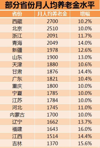 從增幅看,這18個省份月人均養(yǎng)老金水平的增幅均在國家規(guī)定的增幅(10%左右)以上,其中,福建增幅最高,為16%左右。